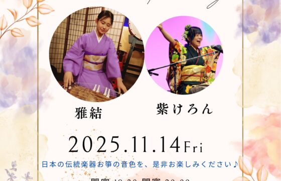 《箏日和 雅結・紫けろん》 令和7年11月14日(金) 開宮 19:30 開宴 20:00 ご来宮料 1,500+投げ銭+ご飲食料 配信チケットはこちら! https://premier.twitcasting.tv/r...
