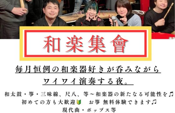 和楽集會 “Japanese music collection” 19:00-23:00 毎月開催 〜和楽器仲間が飲みながらワイワイ演奏する夜〜 お箏無料体験あり、初めての方大歓迎! 和楽器好きもそうじゃない人もお気軽に...